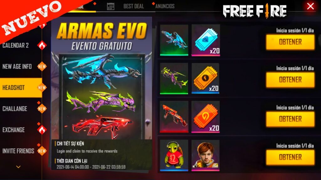 Free Fire 2025 ha activado varios eventos con recompensas gratuitas relacionadas con armas evolutivas. Estos son algunos: